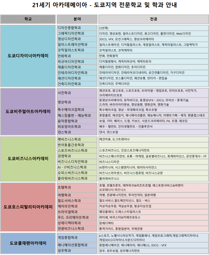 다큐멘터리, 디지털 애니메이션, CG, VFX, 뮤직 비디오 등 각 분야를 전문적으로 배울 수 있는 커리큘럼이 준비되어 있습니다. 디지털 하이비젼에 대응하는 스튜디오와 최신VFX•편집기를 완비하고 있으며, 현장에서 활약하는 프로에게 폭넓은 지식과 수준높은 기술을 직접 배울 수 있습니다.