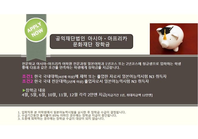 ●공익재단법인 아시아・아프리카문화재단 장학금 (최대12만엔): JLPT N3이상(문의요망) ●문부성외국인유학생학습장려비제도 48,000엔/월 |