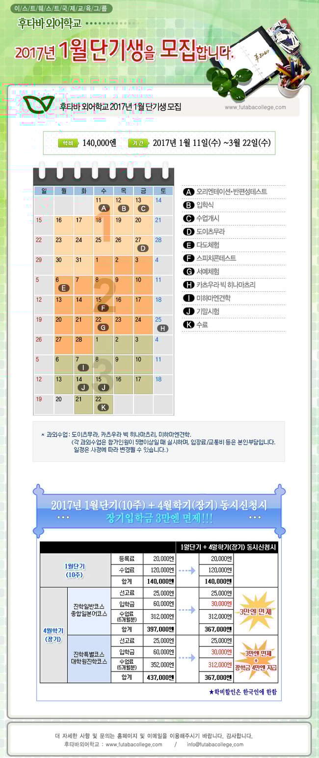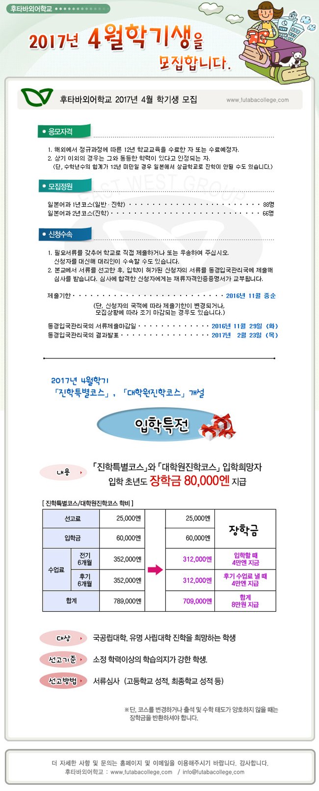 05日 10月 2016 치바 후타바외어학교 1월단기/ 4월장기 모집 / 신설 :진학특별코스 특전 치바 후타바외어학교 1월단기/ 4월장기 모집 / 신설 :진학특별코스 특전 tagPlaceholderカテゴリ: